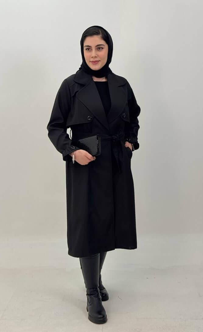 مانتو بارونی مشکی کمرکش بلند کد 32269
